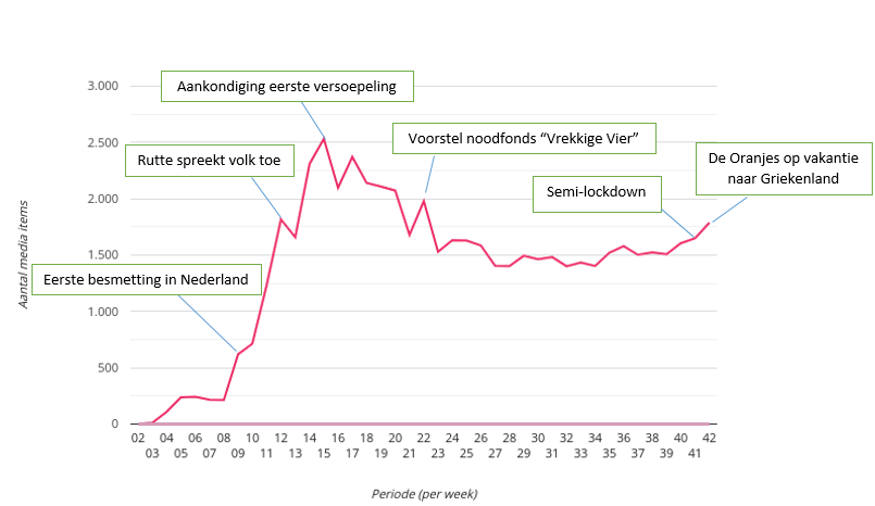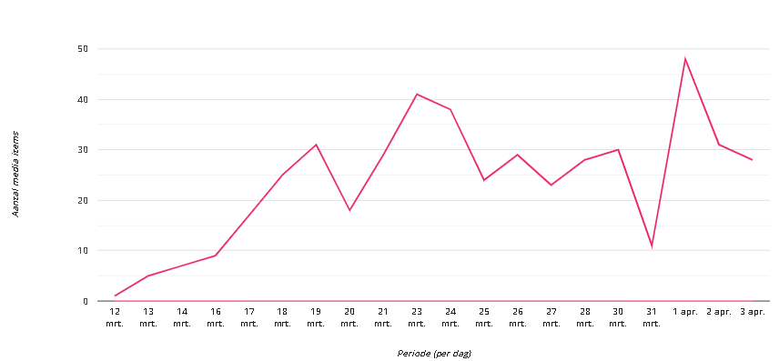 Het gefaseerd invoeren van maatregelen in maart, eerst de sluiting van horeca en scholen, later het groepsverbod, zorgde daarnaast voor minder scherpe pieken in het aantal artikelen dat specifiek over een lockdown sprak.